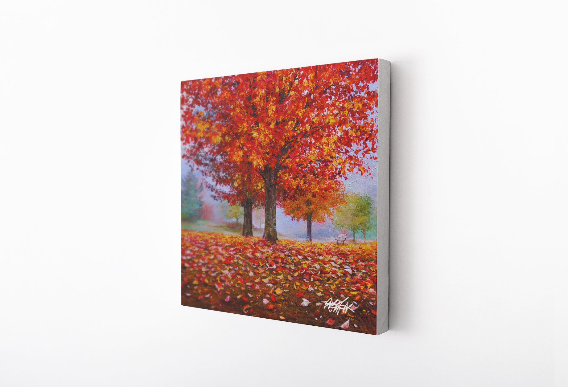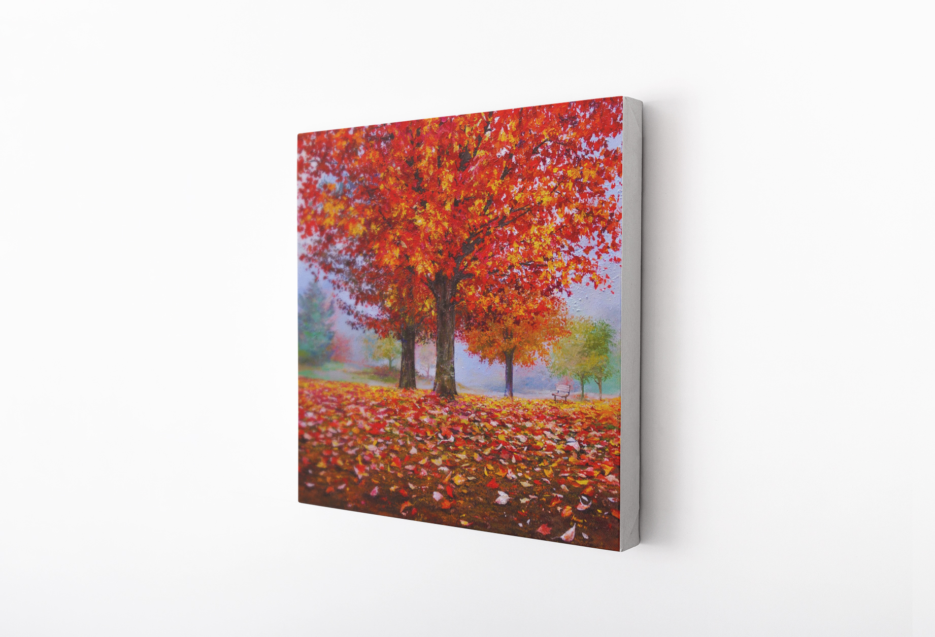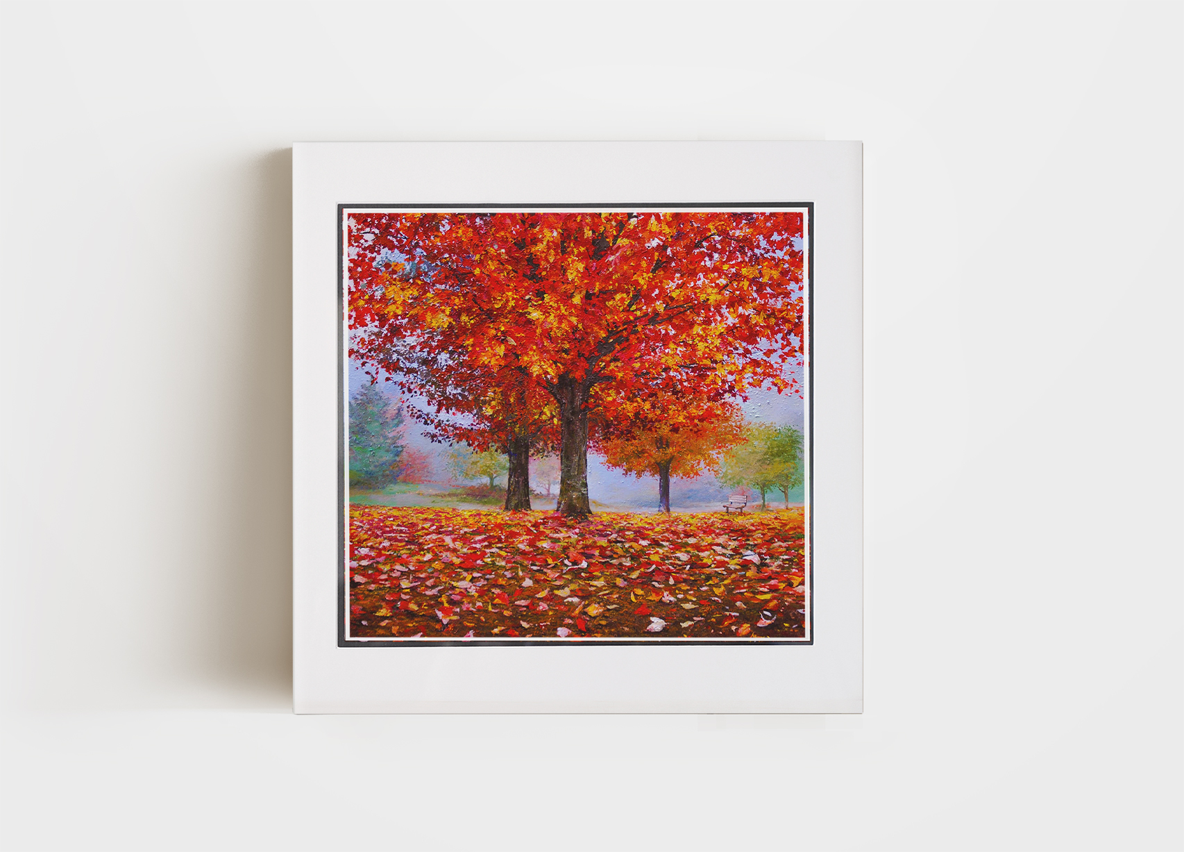 Painting at the age of 14, the following painting by Akiane presents a vibrant autumn scene featuring a large tree with bright red and golden leaves, standing proudly in a park. The ground is covered in fallen leaves, creating a colorful carpet of red, orange, and yellow tones. The soft, misty background and the distant trees fade into a light haze, creating a peaceful and serene atmosphere. A lone park bench in the background invites the viewer to pause and reflect, adding to the tranquil setting. The brilliant colors of the foliage and the attention to detail capture the beauty of the fall season.