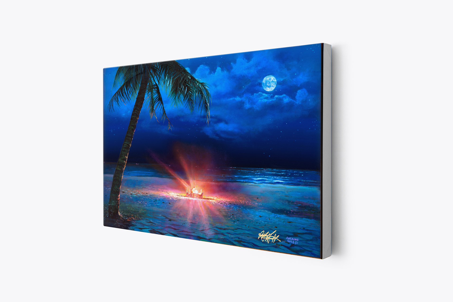 This 9×12 stretched hand-embellished canvas of “Midnight Insight” is individually enhanced by Akiane, making each piece truly one of a kind. Subtle hand-applied textures bring added depth to the moonlit sky, ocean reflections, and glowing fire. This edition bridges fine art reproduction and original artwork, offering collectors a uniquely personal expression of the painting.